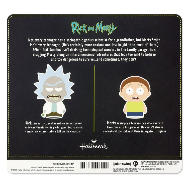 Embark on interdimensional adventures with this plush itty bittys duo. Direct from C-137 (or who knows which dimension, really) comes scientific genius Rick Sanchez, holding his trusty portal gun, and his oh-so-anxious grandson Morty Smith in stylized stuffed animal forms. The itty bittys plush set is perfect for reliving the hilarious hijinks of the animated sci-fi sitcom “Rick and Morty.”