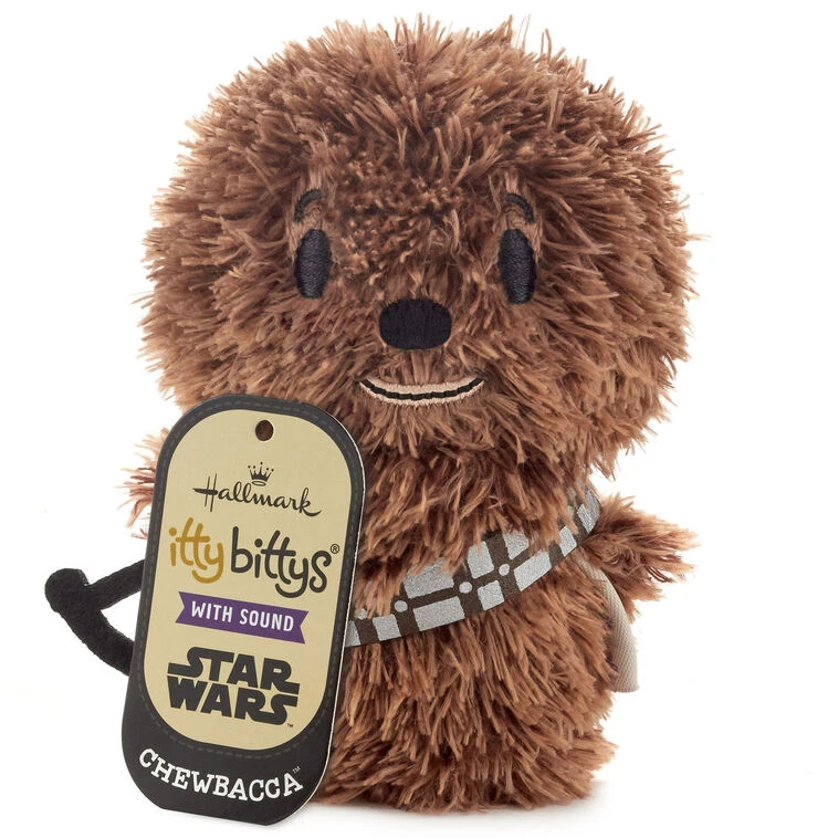 Bring adventure to your day when you add this itty bittys Chewbacca stuffed animal with sound to your collection. A loyal Wookiee co-pilot to Han Solo on the Millennium Falcon, this stylized Star Wars Chewie wears his bandolier and stands at the ready with his bowcaster to help the Rebel Alliance fight the Galactic Empire. Chewbacca plush plays one of five different sounds when you squeeze it.
