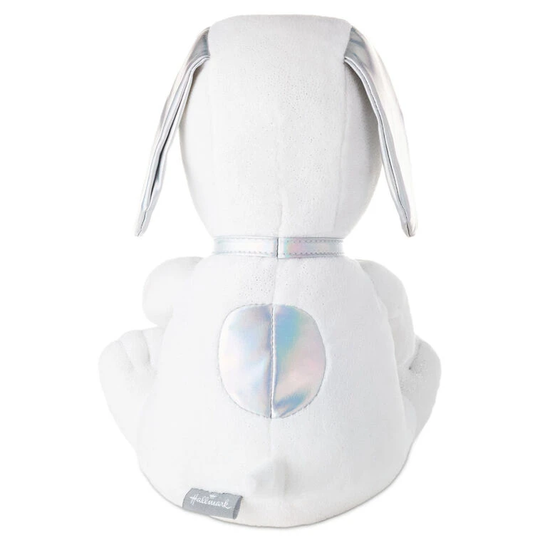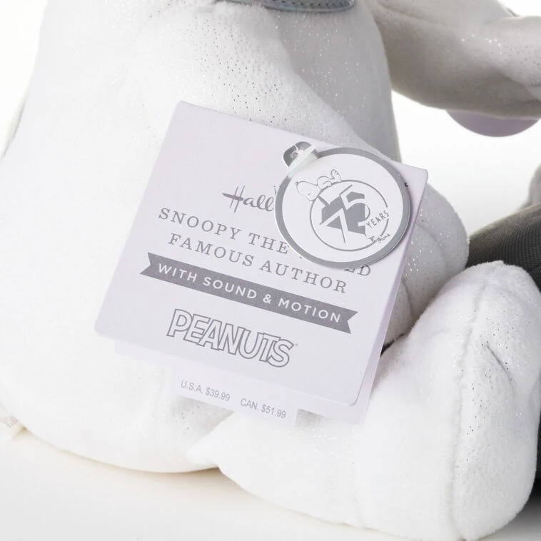 - Peanuts Snoopy animated stuffed animal features the beloved beagle with iridescent silver ears, nose and spots, sitting upright at a typewriter.