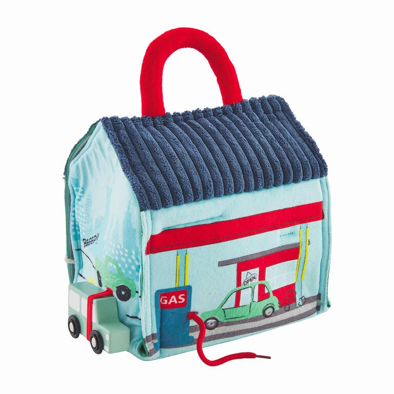 Fuel your child’s imagination with this 5-piece car set. The plush toy garage unfolds to reveal a maze of roads and bridges. Your child can pretend to fix the 3 wooden cars with the felt wrench or fill them up with the shoelace gas hose. This garage and car play set makes a great Easter or birthday gift for your preschooler.